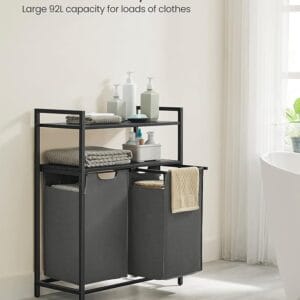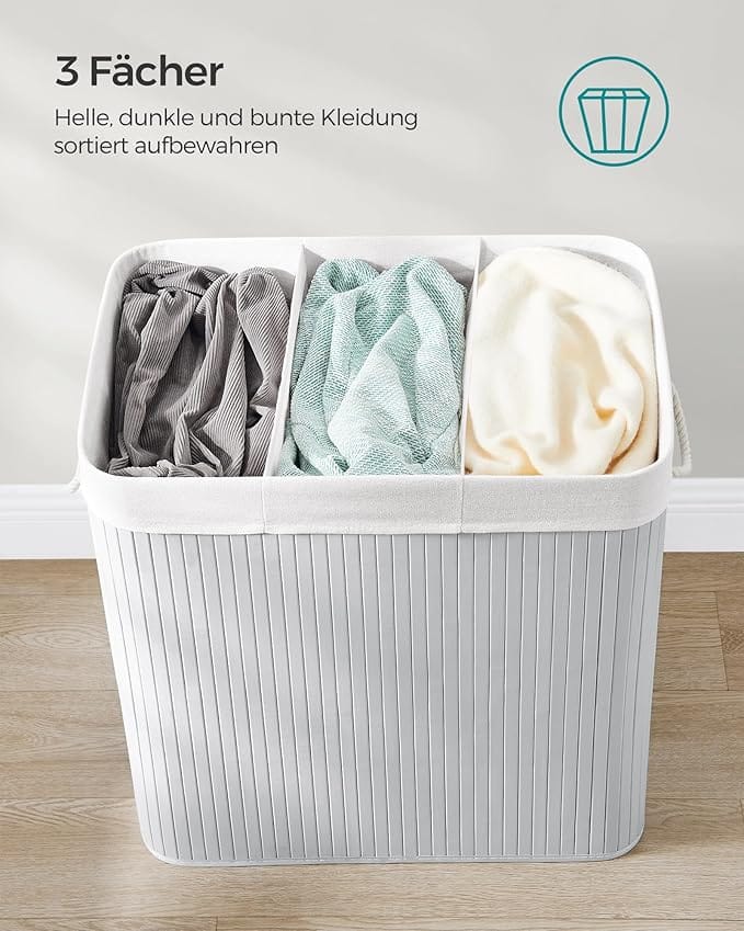 Šiame 3 maišų skalbinių krepšyje iš anksto surūšiuokite šviesius, tamsius ir spalvotus drabužius, kad skalbimo dieną nereikėtų jų rūšiuoti.Bambuko grotelės yra patvarios, pasižyminčios dideliu stabilumu ir tvirtumu. Skalbinių krepšys gali išlaikyti 25 kg svorį. Erdvi 150 litrų talpos skalbinių dėžė sutalpins viską ir palaikys jūsų namuose tobulą tvarką.