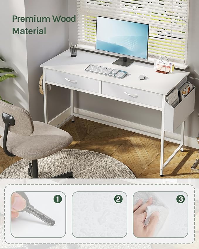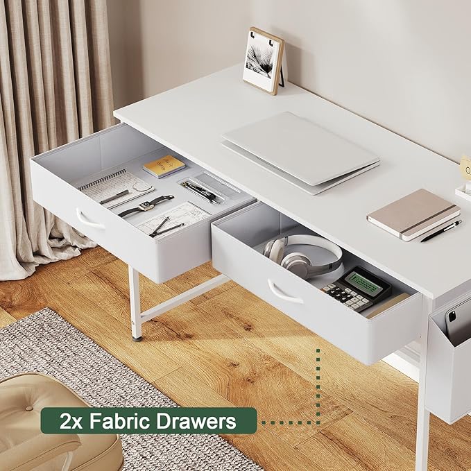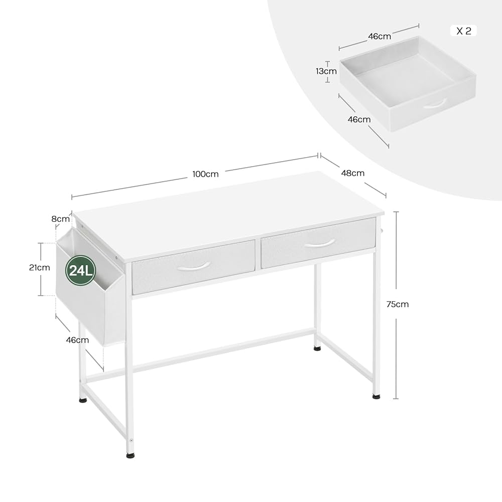 Stalviršis su 2 tekstilės dėžėmis ir šoniniais daiktadėžėmis efektyviai sutvarko biuro reikmenis ir smulkius daiktus – idealiai tinka namų biurui ar vaikų darbo vietai. Stabili metalinė konstrukcija: Sutvirtintas metalinis rėmas su reguliuojamomis kojelėmis užtikrina tvirtą stabilumą ant bet kokių grindų – puikus kompiuterio darbo stalas kasdieniam naudojimui. Kompaktiškas, tinkantis mažiems kambariams: 100 x 48 cm dydžio stalviršis puikiai tinka vaikų kambariuose, miegamuosiuose ar mažuose namų biuruose, nešvaistydamas vietos.Universalus pritaikymas: nesvarbu, ar tai būtų mokymosi stalas, darbo vieta biure, ar tualetinis staliukas – lanksti konfigūracija atitinka visus reikalavimus.