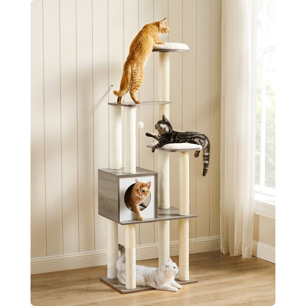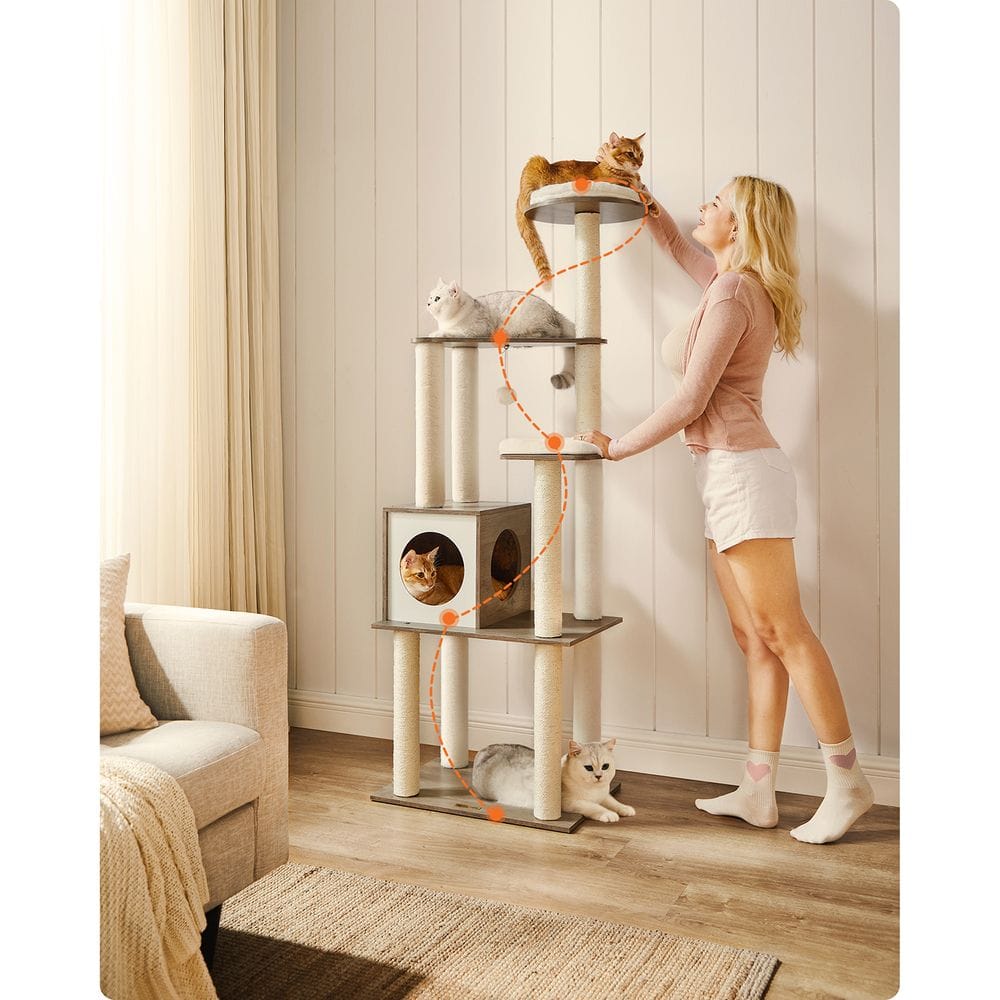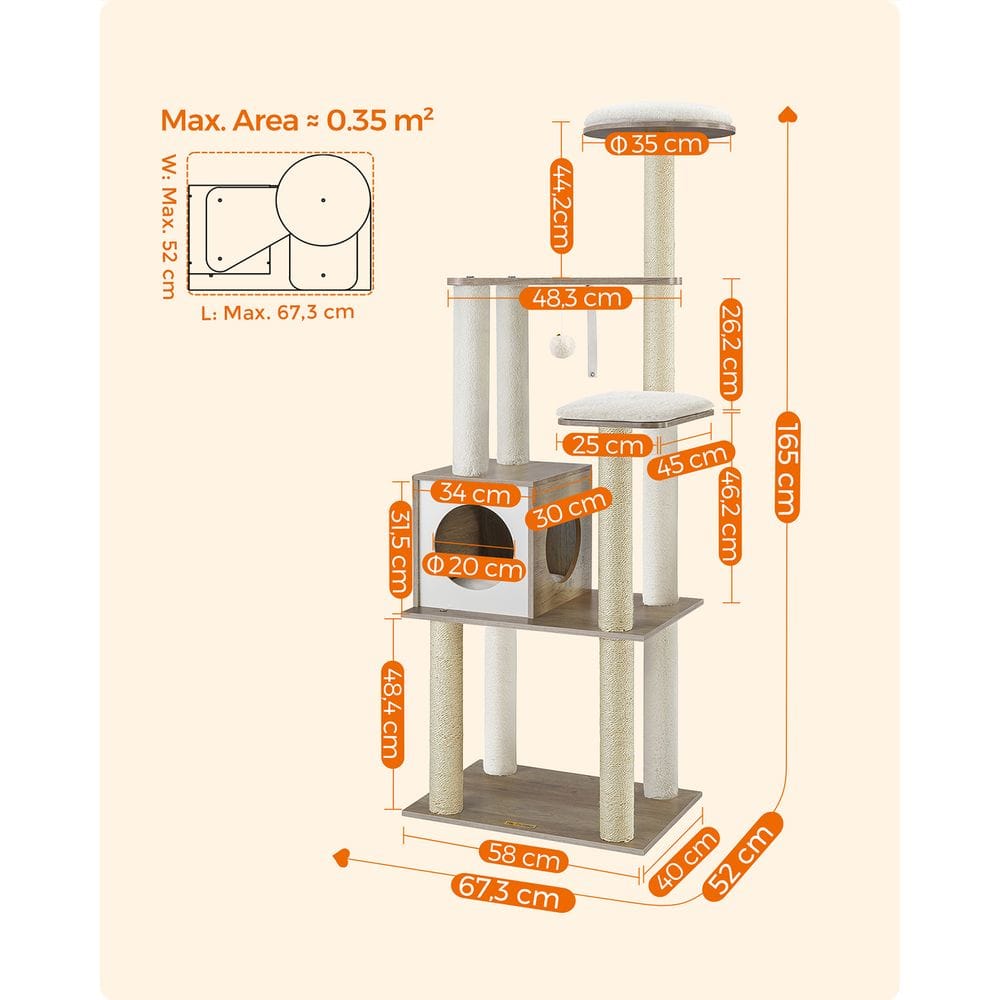 Šis modernus katėms skirtas draskyklė su kaimiška ruda ir elegantiška balta spalvomis lengvai dera prie daugumos namų stilių ir atnaujina jūsų erdvę. Stebėkite paukščius ant viršūtinės laktos, miegokite oloje ar žaiskite ant pagrindo lentos – šis 165cm aukščio katėms skirtas dreifas siūlo įvairių pramogų skirtinguose lygiuose jūsų katėms ir idealiai tinka namų ūkiams, kuriuose yra daug kačių. Pagalvėles galima valyti pūkų surinkimo voleliu kasdienei priežiūrai, o giluminiam valymui jas galima nuimti ir skalbti. Faneruotas paviršius yra lygus, todėl plaukus ir nešvarumus galite nuvalyti šluoste. Pagamintas iš medžio drožlių plokštės ir patvaraus sizalio, su pastorintu pagrindu su neslystančiomis pagalvėlėmis apačioje ir apsaugotas nuo apvirtimo, šis katėms skirtas baldas yra tvirtas, stabilus ir saugesnis katėms lipti aukštyn ir žemyn.