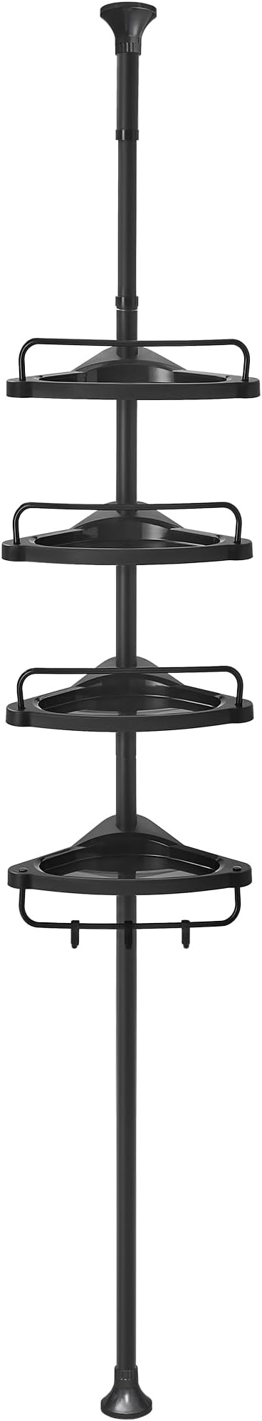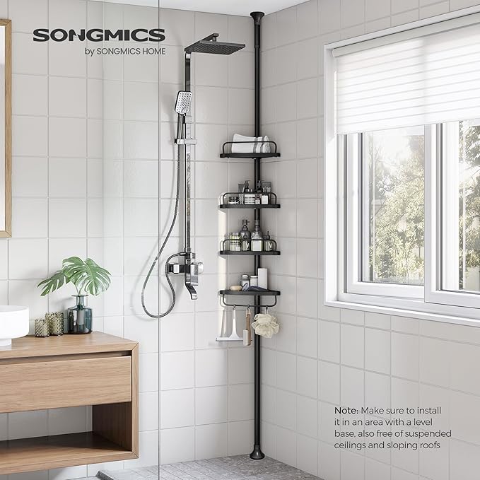 Reguliuojamo aukščio kampinė dušo lentyna yra atspari vandeniui ir rūdims, todėl puikiai tinka naudoti vonios kambaryje. Yra keturios lentynėlės šampūnams, dušo geliams bei trys kabliukai kempinėms, pirštinėms, todėl yra daug vietos, kad visi jūsų vonios kambario reikmenys būtų tvarkingai sutvarkyti vienoje vietoje. Lentynėlių aukštis reguliuojasi, lentynos vamzdis taip pat reguliuojamas, išsikelia iki 305cm aukščio.