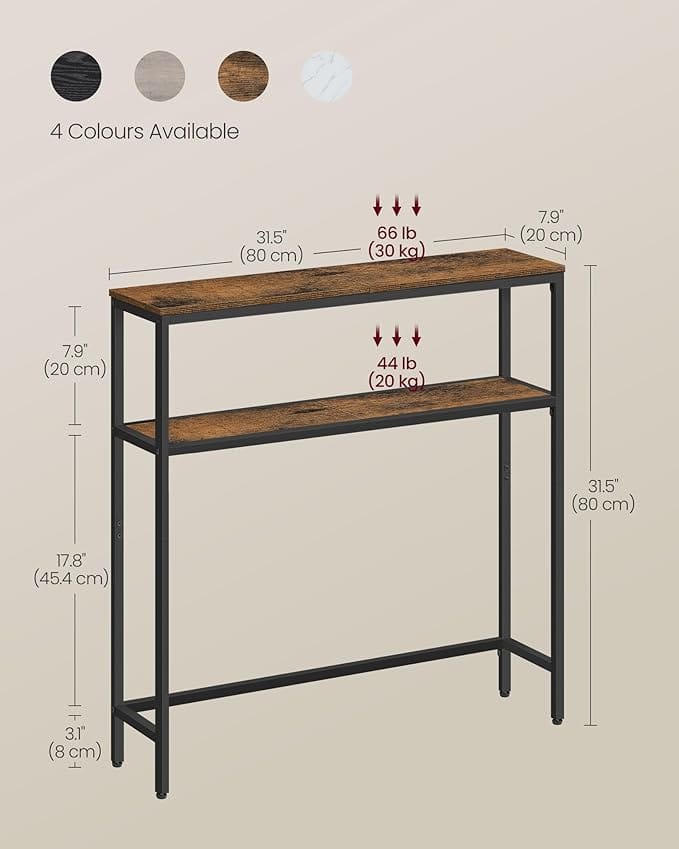 Šis konsolinis staliukas, puikiai tinka mažoms erdvėms. Jo 2 praktiškos lentynos suteikia daug vietos tvarkingai susidėti knygas, vazoninius augalus ir kasdienius daiktus, užtikrinant tvarkingą ir stilingą namų atmosferą. Pagamintas iš tvirtos medžio drožlių plokštės ir plieninio rėmo, šis staliukas gali atlaikyti iki 30kg viršutinėje lentynoje ir 20kg apatinėje. Reguliuojamos kojelės užtikrina stabilumą ant nelygių grindų ir apsaugo nuo nepageidaujamo svyravimo. Šis dviejų pakopų konsolinis staliukas puikiai tinka jūsų prieškambaryje laikyti raktus ir žurnalus, prie lango eksponuoti mėgstamus augalus arba svetainėje kaip stilingas sofos staliukas. Prekė ekspozicinė.