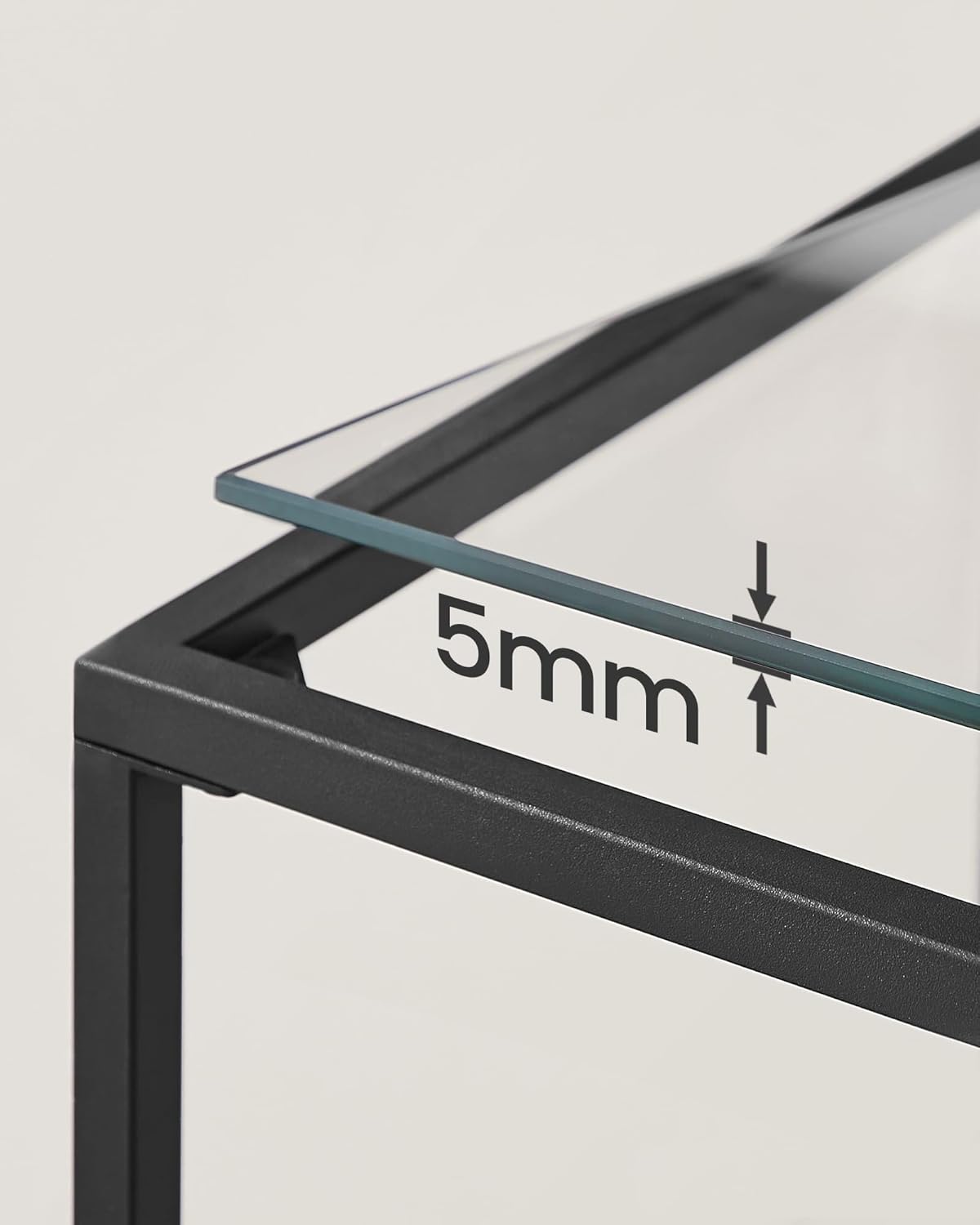 Praskaidrinkite savo namus šiuo moderniu, stilingu konsoliniu staliuku, kurį sudaro elegantiškas, juodos spalvos plieninis rėmas ir 2 grūdinto stiklo lentynos. Prie durų kaip konsolinis staliukas? Šalia sofos kaip staliukas prie sofos? Miegamajame kaip kosmetinis staliukas? Darbo kambaryje kaip kompiuterio stalas? Šį ploną staliuką galite naudoti bet kur, kur jums jo reikia. Kiekviena lentyna, pagaminta iš 5 mm storio grūdinto stiklo, yra pakankamai tvirta, kad išlaikytų iki 20 kg svorį; vandeniui atsparias stiklo plokštes lengva valyti drėgna šluoste. Tvirtas plieninis rėmas, sujungtas sutvirtintomis jungtimis, užtikrina šio  staliuko stabilumą ir tvirtumą; įrengtos reguliuojamo aukščio kojelės išlaiko jį subalansuotą net ir ant šiek tiek nelygių grindų.