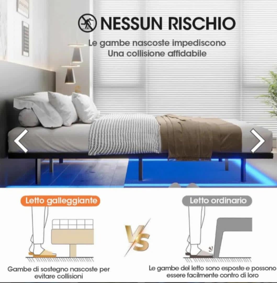 Lovos rėmas turi tris šonines paslėptas šviesos juostas po lovos rėmu. Led lemputės šviečia įvairiomis spalvomis. Šviesos intensyvumą galite reguliuoti mygtukais. Rėmas aplink perimetrą yra pagamintas iš 38 mm x 25 mm geležinio vamzdžio, o skersinis rėmas ir 9 atraminės kojelės- iš 25 mm x 25 mm geležinio vamzdžio. Kiekvienas metalinis lovos rėmo platformos komplektuojamas su 4 čiužinio slankiojimo stabdikliais. Tiesiog prispauskite jį prie pritvirtinto metalinio lovos rėmo ir jis apsaugos nuo nepageidaujamo čiužinio judėjimo ar slydimo. Išmatavimai : 90cmx200cmx20cm