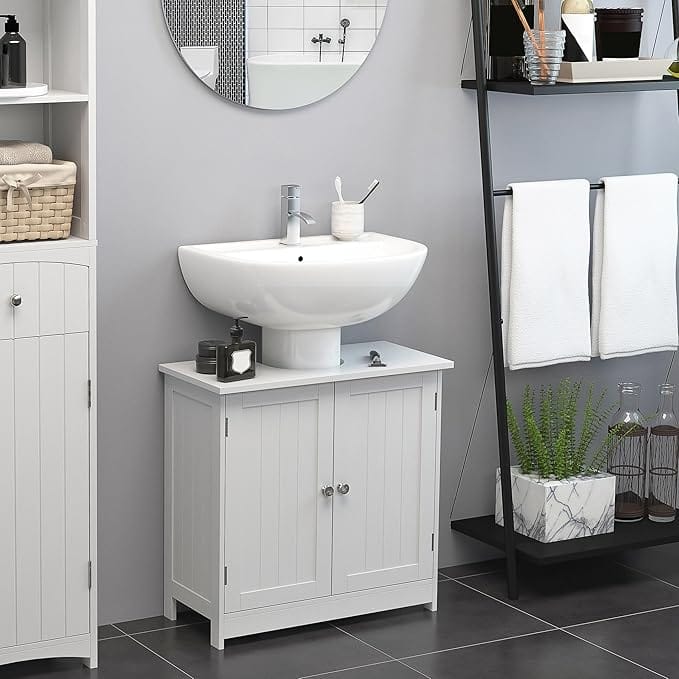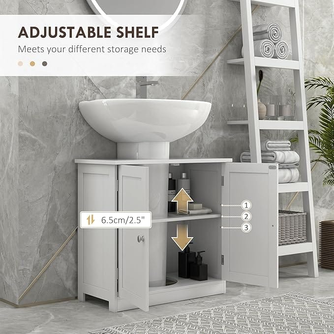 Ši vonios kambario praustuvo spintelė skirta pastatyti po atvira kriaukle ir yra U formos, kad vonios kambaryje būtų daugiau vietos daiktams susidėti.vonios kambaryje niekada neužtenka vietos viskam, ko jums reikia. Šioje spintelėje ant pjedestalo yra uždara vieta daiktams laikyti, todėl galite laikyti rankšluosčius, kasdienes higienos priemones ir valymo priemones. Spintelės viduje yra reguliuojama lentyna, kurią galima pakelti ir nuleisti, kad atitiktų skirtingus jūsų laikymo poreikius. Dvigubų durų konstrukcija efektyviai apsaugo jūsų daiktus nuo drėgmės.Vonios kambario spintelė pagaminta iš MDF ir gali atlaikyti iki apie 15 kg bendrą svorį ir apie 5,4 kg kiekvienoje lentynoje, todėl joje tilps visi reikalingi tualetiniai reikmenys. Prekė ekspozicinė.