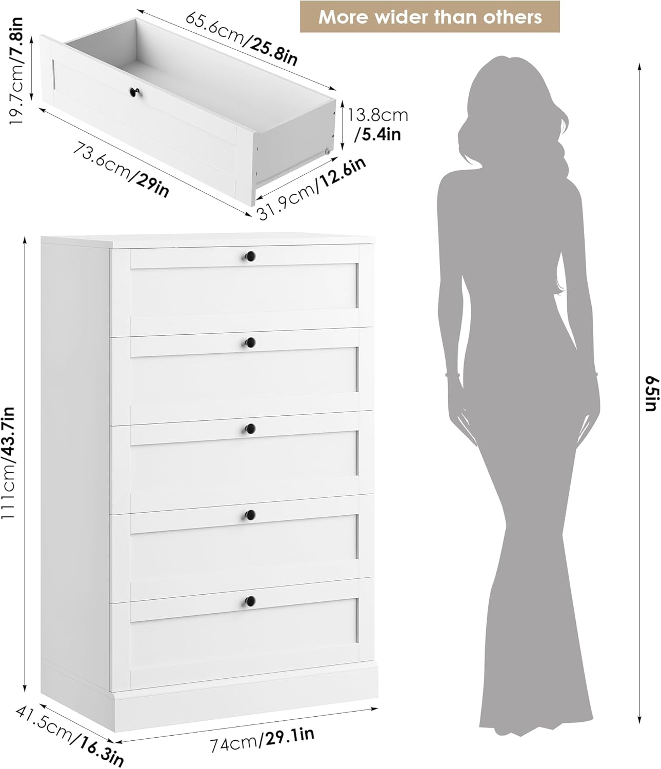 Komoda su stalčiais dekoracijoms eksponuoti ir dažnai naudojamiems daiktams susidėti, konsolinė spintelė smulkiems daiktams susidėti, televizoriaus staliukas medijos įrenginiams: kad ir kam ją naudotumėte, ši balta komoda su 5 stalčiais yra tobulas sprendimas,  daiktams susidėti ir suteikti jūsų kambariams tvarkos pojūtį. Natūrali balta spalva sklandžiai dera prie bet kokios spalvų schemos svetainėje, prieškambaryje ar biure, aptakus siluetas ir rankenos detalės užbaigia estetiką, o klasikinis stilius puikiai dera su esamais dizaino įkvėpimo šaltiniais, tokiais kaip šiuolaikinis, sodybos, kaimiškas stilius. Pagaminta iš aukštos kokybės dirbtinės medienos, sklandžiai slystantys bėgeliai užtikrina puikų komodos tvirtumą ir ilgaamžiškumą – viršutinė lenta gali atlaikyti iki 122 kg, o kiekvienas stalčius – iki 22 kg. Apsaugos nuo apvirtimo įtaisas yra specialiai sukurtas siekiant didesnio stabilumo ir saugumo. Prekė ekspozicinė.