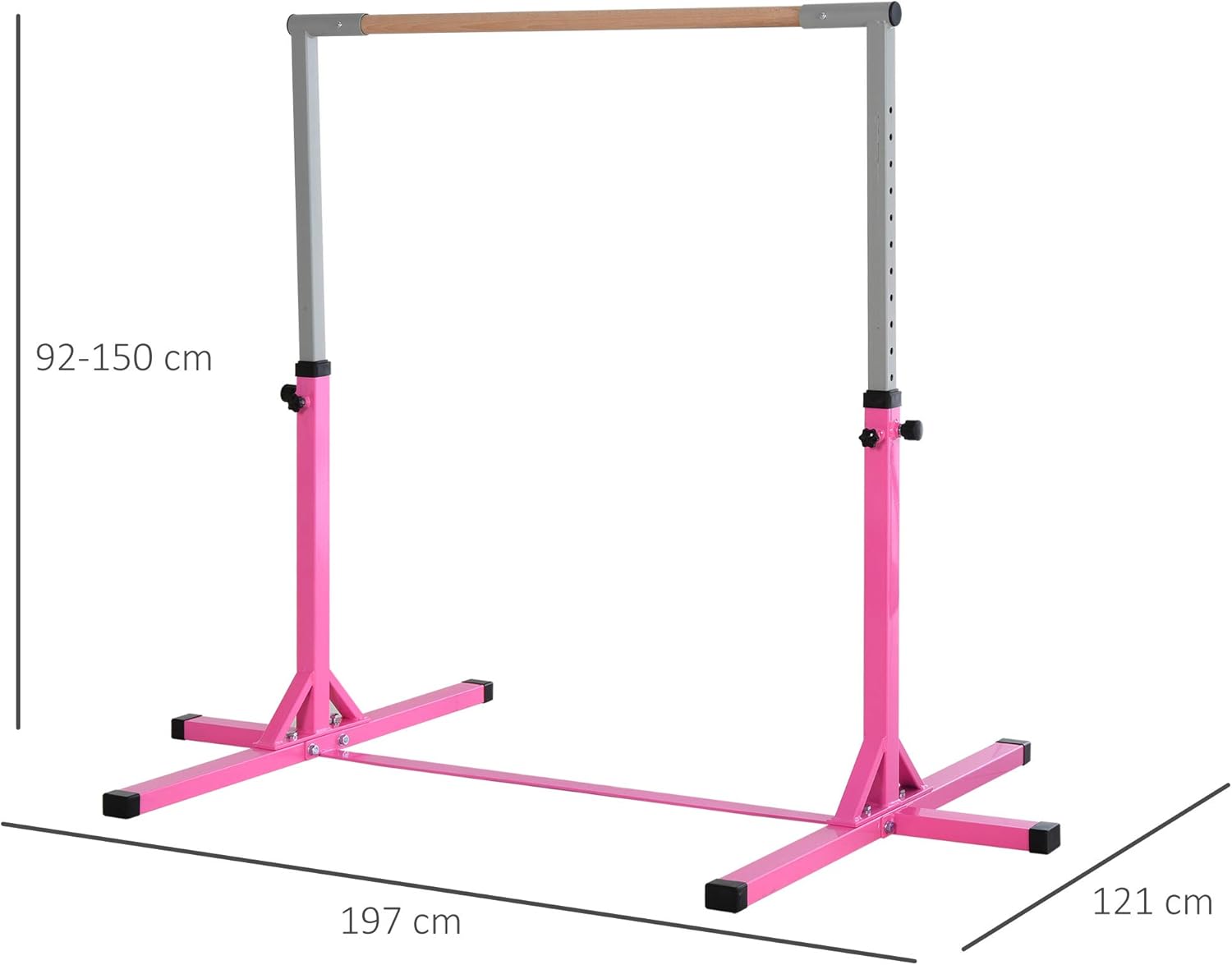 Pagaminta iš tvirto ir patvaraus plieninio vamzdžio su slėginiu dengimu ir tvirtos buko medienos, skirtos ilgam naudojimui. Gimnastikos skersinis turi 13 reguliuojamo aukščio lygių, tarp kurių yra 4,8 cm atstumas. Minimalus aukštis yra 93 cm. Tinka įvairaus amžiaus vaikams. Gumuoti pagrindo kampai apsaugo grindis nuo įbrėžimų ir užtikrina stabilesnį bei saugesnį stovėjimą.