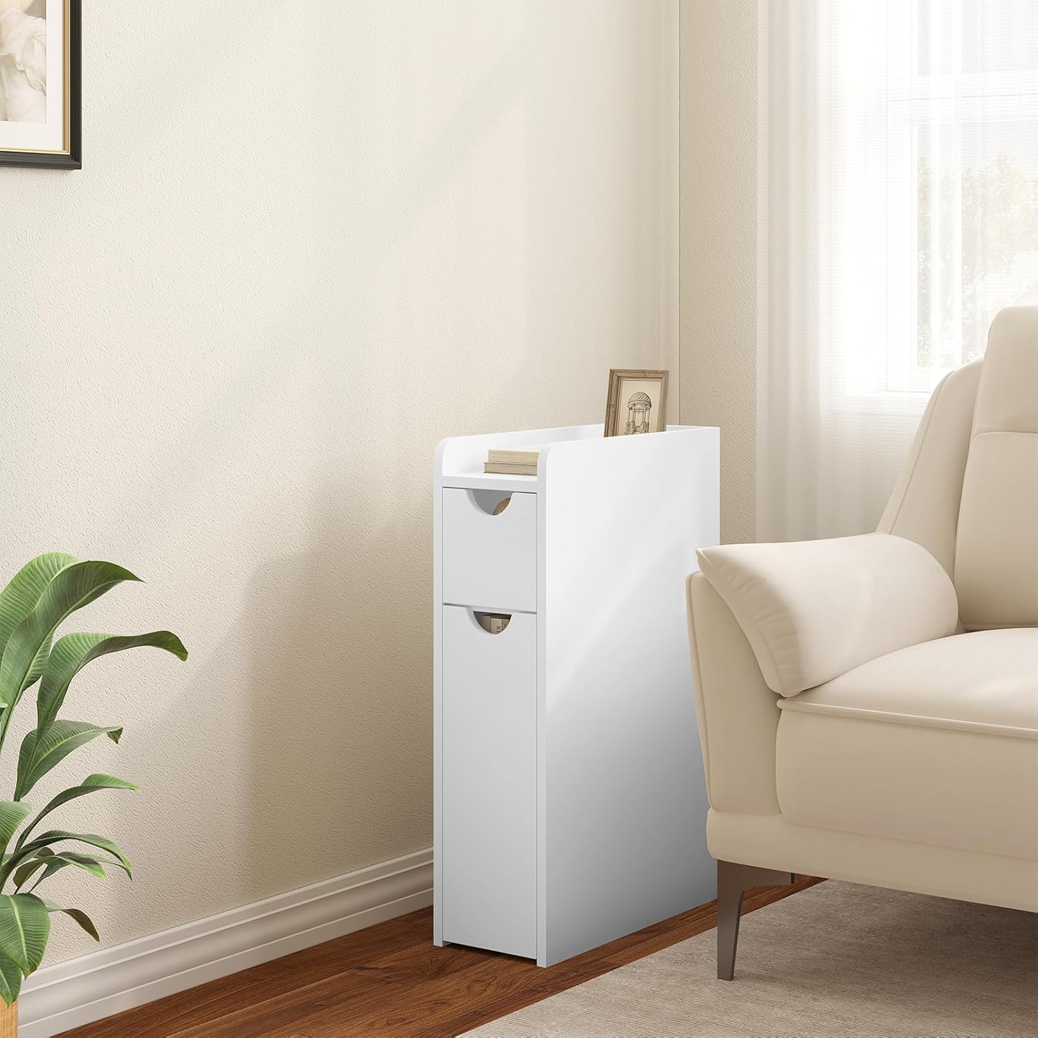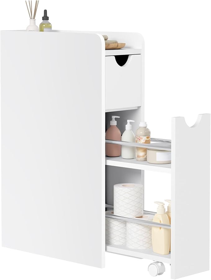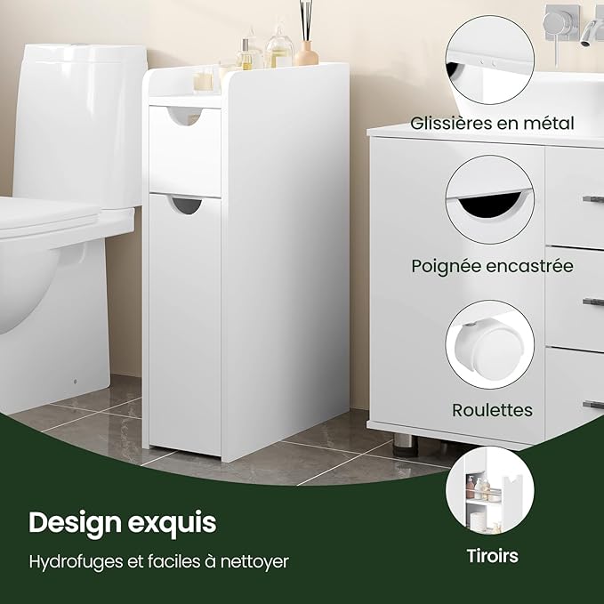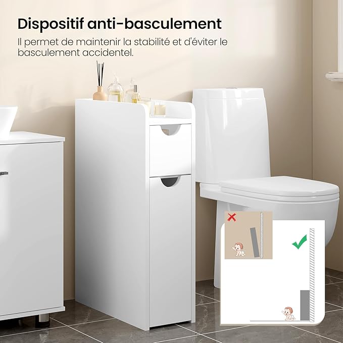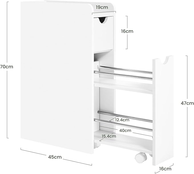 Maža vonios spintelė turi 2 stalčius daiktams susidėti pagal kategorijas: viršutinis stalčius kosmetikai ir smulkiems daiktams, o apatinis – dideliems skalbinių buteliams ir kitiems kasdieniams daiktams. Ant padėklo su 5 cm krašteliu galite pasidėti mobilųjį telefoną, dantų šepetėlį, odos priežiūros priemones ir kitus dažnai naudojamus daiktus. Siauros tualetinio popieriaus spintelės apačioje esantis stalčius yra su ratukais, kad būtų lengva ištraukti ir pasiekti norimus daiktus. Tvirtinimo plokštelė apačioje neleidžia apatiniam stalčiui iškristi. Idealiai tinka mažoms erdvėms: 19 x 45 x 70 cm matmenys leidžia šiam kampiniam spinteliui puikiai tilpti į vonios kambario ar virtuvės kampus. Tualeto spintelė pagaminta iš aukštos kokybės medžio drožlių plokštės, kuri yra atspari dilimui ir įbrėžimams, lengvai valoma. Pridedamas apsaugos nuo apvirtimo įtaisas neleidžia šoninei spintelei apvirsti, kad būtų galima saugiai ją naudoti. Tai patikimas ir universalus baldas. Prekė ekspozicinė.