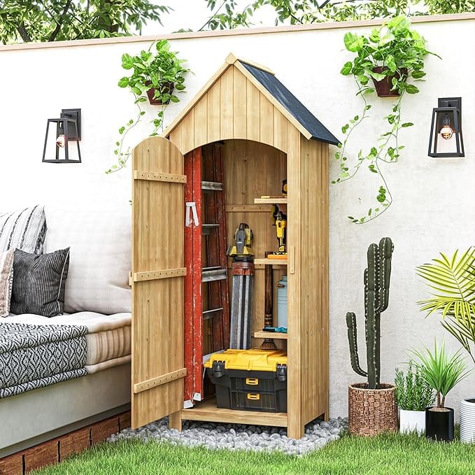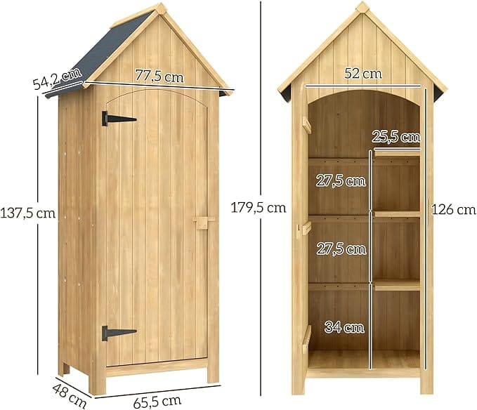 Pagamintas iš tvirtos eglės medienos, padengtos vandeniui atspariais dažais, gali atlaikyti atšiaurius lauko veiksnius. Atsparus korozijai ir pelėsiui. Atlenkiamas stogas su juodu vandeniui atspariu asfalto veltiniu apsaugo nuo vandens kaupimosi. Puiki alternatyva sodo įrangai laikyti sode ar kieme.Erdvi sandėliavimo patalpa leidžia laikyti kuo daugiau įrankių ir priedų. 3 lentynos puikiai tinka tvarkingai susidėti reikalingus smulkius įrankius.Atverčiamos priekinės durys užtikrina lengvą prieigą ir papildomą saugumą su skląsčio konstrukcija. Kiekvienos lentynos maksimali apkrova: 10 kg, Apatinės plokštės maksimali apkrova: 25 kg.