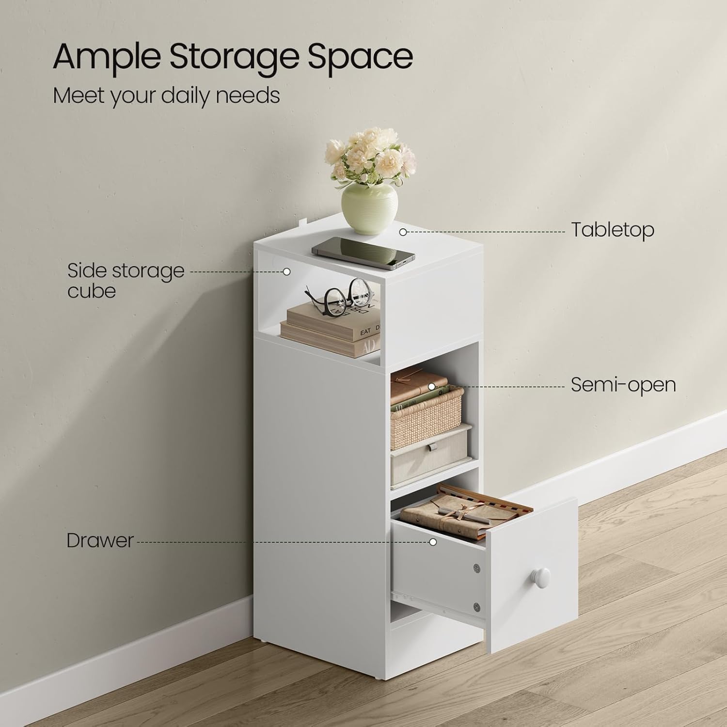 Kompaktiškas ir funkcionalus naktinis staliukas su dviem atviromis lentynomis ir stalviršiu suteikia pakankamai vietos būtiniausiems daiktams. Apatinis stalčius (17 x 11,5 x 24 cm) yra atsparus drėgmei ir tinka asmeniniams daiktams laikyti. Dėl siauro, aukšto ir pusiau atviro dizaino staliuką galima pastatyti tiek dešinėje, tiek kairėje lovos pusėje. Pagamintas iš 15 mm storio medienos su melamino danga, jis yra tvirtas, stabilus, lengvai valomas ir atsparus dilimui. Puikiai tinka naudoti kaip naktinį, šoninį ar svetainės staliuką.