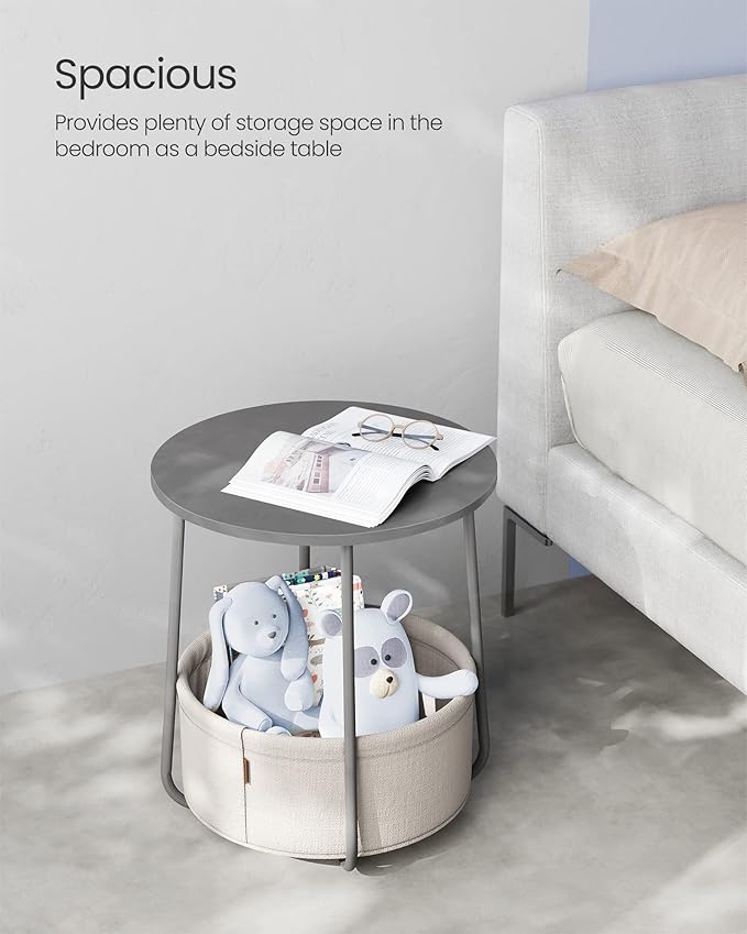 Šoninis staliukas su audinio krepšiu – kompaktiškas, bet talpus sprendimas mažoms erdvėms. Puikiai tinka naudoti kaip naktinis staliukas miegamajame ar šoninis staliukas svetainėje. Tvirtas medžio drožlių plokštės stalviršis stabiliai pritvirtintas prie U formos plieninio rėmo, o reguliuojamos kojelės apsaugo grindis nuo įbrėžimų ir užtikrina stabilumą. Dviejų sluoksnių poliesterio krepšelis, malonus akiai ir be chemikalų, suteikia papildomos vietos daiktams laikyti. Surenkamas per 5–10 minučių, stalas išsiskiria savo lininę primenančia tekstūra ir minimalistiniu dizainu.